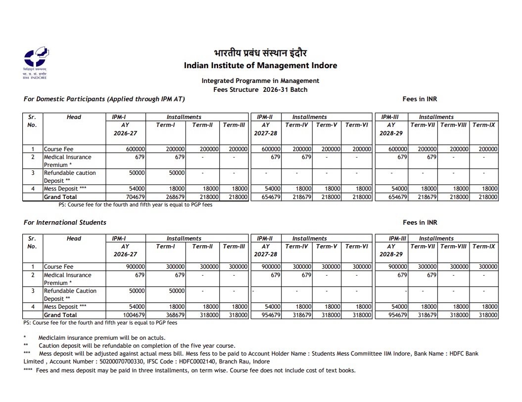 Fee Structure IPM 2026-31 | Fee Structure IPM 2025-30 | Fee Structure IPM 2024-29 | Fee Structure for IPM 2023-28 | Fee Structure for IPM 2022-27