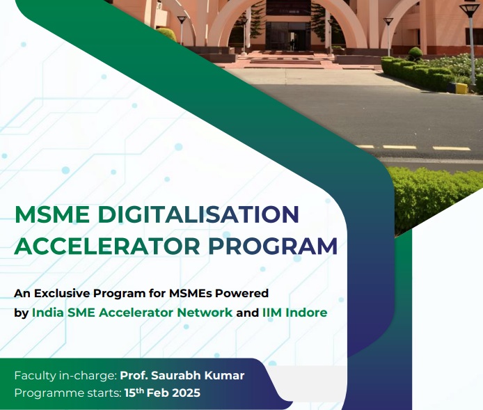 IIM Indore and India SME Accelerator Network present MSME Digitalisation Accelerator Program, a 5-weeks program for MSMEs desirous of enabling digital transformation of their businesses taking it to its next level. The program will be delivered in a hybrid format with virtual and physical sessions and workshops from Industry experts and academic experts, to facilitate digital transformation of your own business