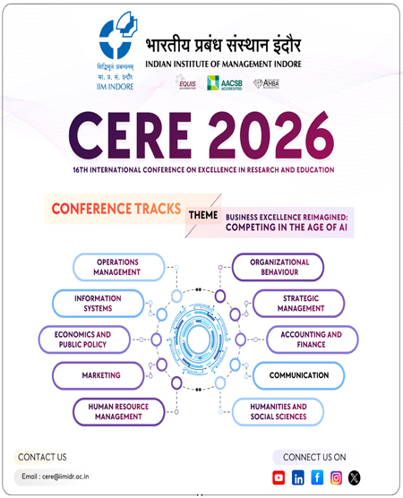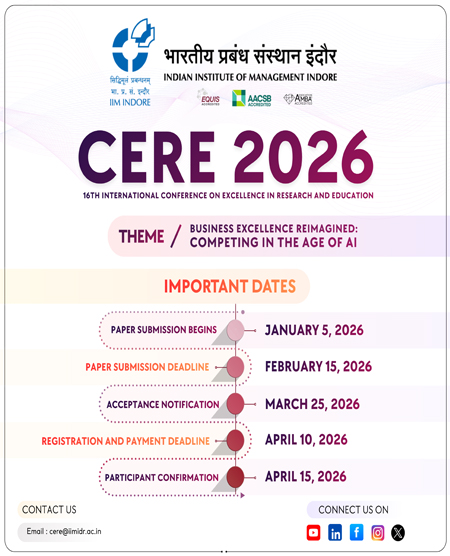 Conference on Excellence in Research and Education (CERE 2026) is organised annually by the Indian Institute of Management Indore (IIM Indore) since 2010. CERE has established itself as a significant platform for fostering international collaboration and knowledge exchange. CERE 2026 will feature a diverse program designed to address both academic and practical dimensions of research and education. Attendees will have the opportunity to engage in academic research presentations, panel discussions, and keynote speeches delivered by leading experts.